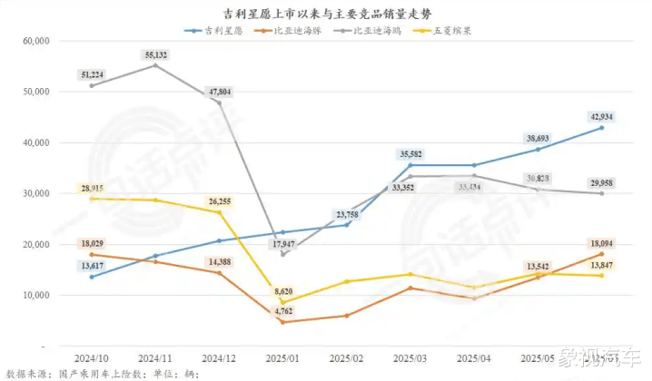 如果说五菱MINI EV是能开、上路就行,那么比亚迪海鸥就不仅好开还好用。至此,微小型新能源和主流家用车的边界开始逐渐模糊。智能车机、300KM以上长续航等开始成为纯电小车的标配。2024年10月份,吉利推出了纯电小车星愿,从价格到定位全方位对标海鸥甚至海豚。比星愿好的没有它便宜,比星愿便宜的没有它好,星愿将纯电小车的性价比拉到极致,自然成为了爆款车,甚至坐上了全品类销冠宝座。
